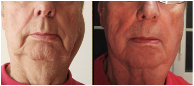 Ahku had an active keratosis on her cheek that was precursor of skin cancer, Bowen’s disease. The diseased skin was operated on, and the surgical scar was treated several times with a dedicated gel. Over six months care the cheek skin was still strongly itching and scaly, and red in surrounding that turned ones a month to a painful bloody scar and further, it dried to a scab that loosed and the scar turned back to itching and scaly condition. Ahku started to take OxPro Shower every day in May 2017 when the diseased skin was in itching and scaly condition as shown in Figure 23a. In two weeks from the start the diseased skin was recovered significantly, inflammation and red were almost vanished, and no itching nor desquamation anymore, Figure 23b. In one month, the diseased skin was recovered, and the monthly cycle of scarf, bloody scar, dried scab, and itching and scaly scar hasn’t recurred within the following control period of a year. The condition is good and stable (Figure 23a, b).
