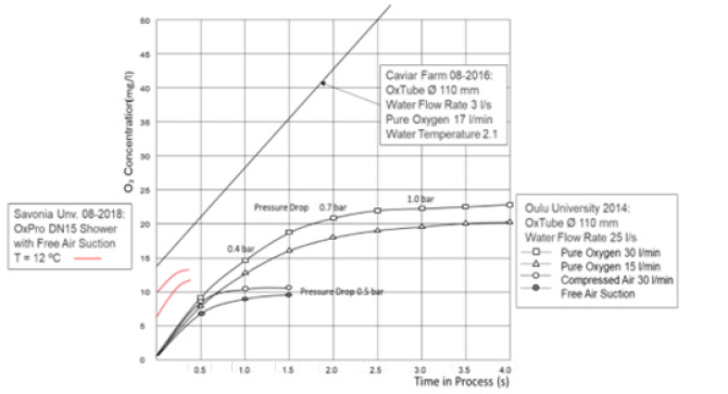 Bubble generation and mixing with the water is visualized in Figure 4. Height of the outtake spray increases nine times when the air channel is open. Gravity of the mixture turns respectively light in the nozzle. The spray of the mixture stays coherent all the way up which is an essential feature of OxTube Machine. Figure 5 shows the oxygenation efficiency of OxTube Machine at early-stage development [4]. Since 2016 separation of dissolved ingredients has improved and gas suction increased by factor of 5. Losses are measured today in terms of mass flow due to huge gravity drop and change from incompressible to compressible liquid in the nozzle zone. The mass flow losses are measured to be less than 2 percent.