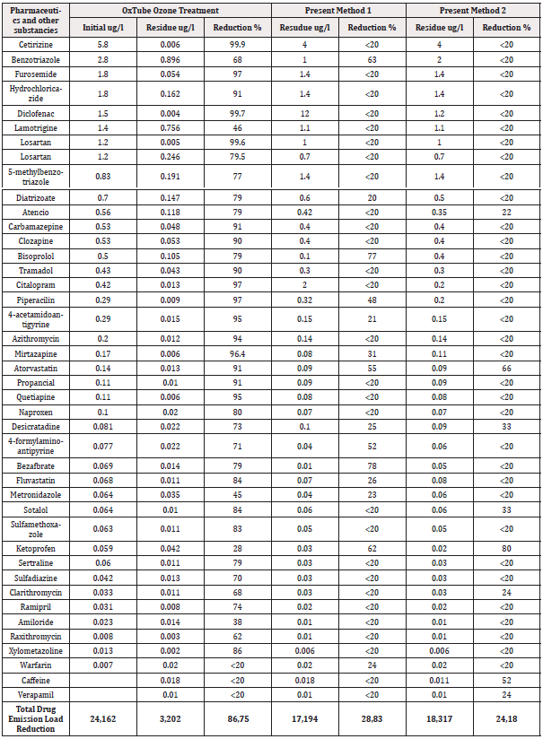 OxTube efficiency in removal of residues of pharmaceutics and some chemicals from a city wastewater is presented in Table 3 including comparison to two present systems. Pharmaceutical residues are a fast-growing disaster in natural waters and ground. About 90 percent of these residues were split, clarified and removed only by one run through OxTube Machine to an open vessel without any filters. Two runs result in a 99 percent reduction. The city wastewater was clarified and oxygenated at the same time with removal of the drug residues. The present wastewater purification systems separate only 1/4 of OxTube performance. There are many chemicals used for decades and led into the nature and food chains like DDT, aldrin, chlordane, chloroform, hexachlorobenzene. The present treatment systems are not able to eliminate these chemicals like drug residues (Tables 1,2,3).