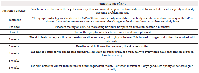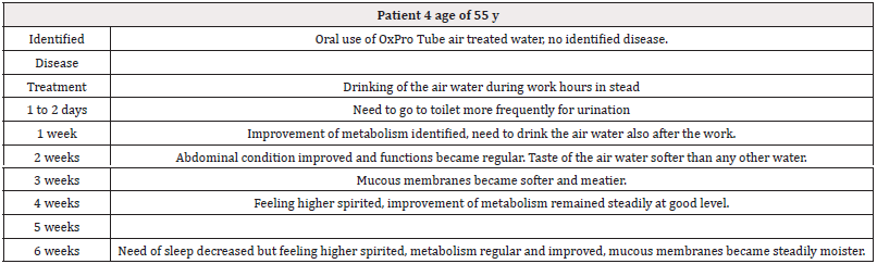 OxPro water treatment device is being in use for health care and wellness services at Stella. The water was just treated in the OxPro Tube right before use orally and on skin. The impacts according to the notes of a nurse of Stella are as follows: