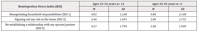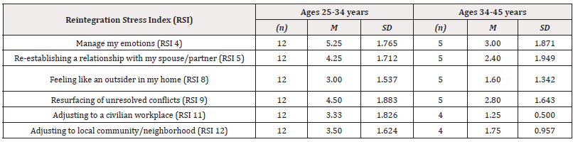 As can be seen in Table 2, the significant participant age difference in Total Reintegration Stress scores show that the younger participants had higher stress scores on 6 of the RSI items. These higher stress scores for the younger participants appear to reflect factors related to managing one’s emotions (RSI 4), re-establishing relationships (RSI 5), feeling like an outsider in one’s home (RSI 8), unresolved conflicts resurfacing (RSI 9), adjusting to civilian workplaces and communities (RSI 11), and adjusting to local community neighborhood (RSI 12). Thus, as shown in Table 2, younger participants (between the ages of 25-34 years of age) reported experiencing a greater amount of perceived reintegration stress across these 6 specific factors in comparison to participants within the age range of 35-44 years of age.
