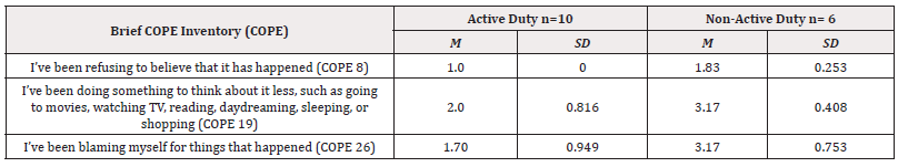 As shown in Table 5, participants with non-active-duty spouses reported a greater frequency of denial, distraction, self-blame while attempting to cope with stressors than participants with active duty spouses. These could be grouped as avoidance of engaging with the non-active-duty spouse regarding the stresses that the woman, participant was experiencing.