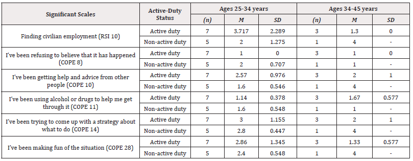 As shown in Table 9, participants with younger spouses (between the ages of 25-34 years of age) and whose spouse was on active duty, and those with spouses in the 34 -44-year-old age range with a non-active duty spouse endorsed a greater frequency of stress related to finding civilian employment as compared to their peers with younger spouses who are non-active duty (RSI 10). Participants with non-active duty spouses between 25-34 years of age reported a slightly greater frequency of utilization of avoidant focused coping skills such as telling themselves “this isn’t real” (COPE 3) and refusal to belief something has happened (COPE 8). Similarly, those with younger, non-active duty spouses reported the least frequency of use of the problem focused coping skills of seeking advice from others (COPE 10). Thus, in general, those with younger, non-active duty spouses, meaning the spouse is at home, were more likely to use avoidant and denial coping mechanisms.