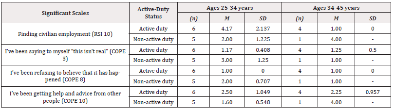 Table 6: Means and Standard Deviation of the interaction effect of Participant Age and Active Duty Status on Reintegration Stress and Coping Styles.