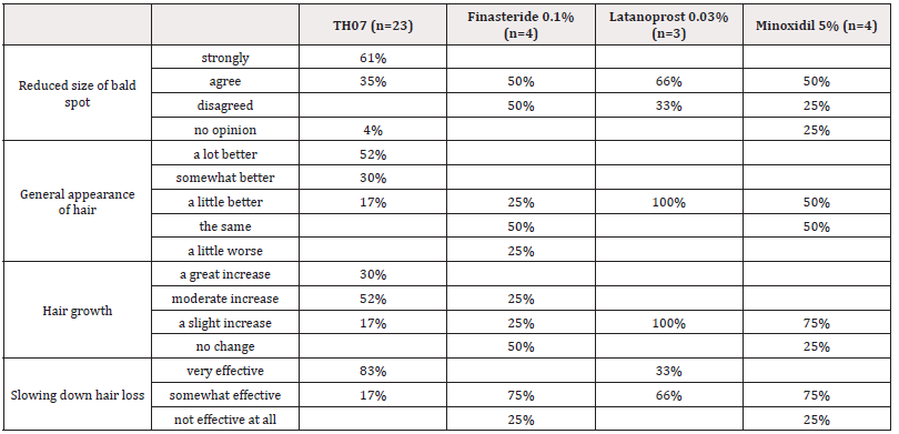 Most of the patients treated with TH07 (61%) strongly agreed, while most of the patients in the Latanoprost (66%) and Minoxidil (50%) agreed that the size of their bald spot has been reduced. Half (52%) of the TH07 group reported that the general appearance of the hair seems a lot better, whereas 100% of the Finasteride group felt it was a little better. The appearance of the hair looked the same for half of the patients in the Finasteride and Minoxidil groups. The majority of the TH07 treated patients (52%) saw a moderate increase in their hair growth, a slight change was reported from the Latanoprost (100%) and the Minoxidil (75%) groups and no change by the finasteride group (50%). A very effective slowing down of hair loss was reported by the TH07 treated patients (83%), while a somewhat effective slowing down was achieved in the Finasteride (75%), Latanoprost (66%) and Minoxidil (75%) groups (Table 2).