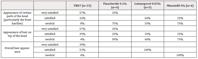 Concerning the overall appearance and their hair, 52% of the responders in the TH07 treatment group were satisfied. When asked about their satisfaction with their overall hair appearance, all participants of the Latanoprost treatment group were satisfied. When asked what they thought about the appearance of parts of their head before and after treatment, all respondents in the Minoxidil treatment group said they were neutral about their hair growth overall.