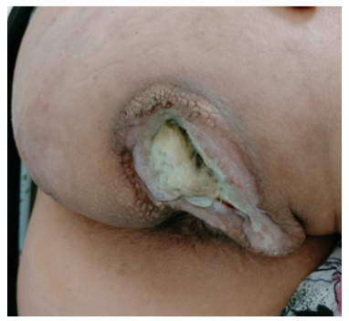 A 55-year-old woman presented with one year history of the presence of a painless mass on the anal region, on which diagnosis of GCT perianal is confirmed, patient has a surgical excision without radiotherapy or chemotherapy adjuvant. 4 years later, this patient arrived at a hospital with a painless mass on the anal region (Figure 1), the thoraco-abdominal and pelvic CT scan showing the presence of a right anal and para-anal mass measuring 130*81mm extended to the surrounding soft tissues and infiltrating the neighboring muscular structures on the right side and the perineal and buttock skin (Figure 2) with pulmonary metastasis.