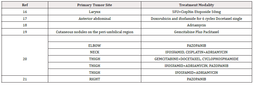Malignant Granular Cell Tumors (MGCTs) are extremely rare sarcomas with Schwannian differentiation [8]. The tumor may be located anywhere in the body, but perianal localization is quite rare [9]. Most of the published studies present cases with local recurrence, the presence of metastasis like ours is rarely described in the literature [10]. Although the etiology and histogenesis of GCT are not completely clear, they can still be characteristic. The current gold standard for the diagnosis of GCT is histopathological and immunohistochemical examination [11]. The histopathological manifestations of GCT are characterized by a neoplastic mass with unclear boundaries in the dermis and subcutaneous tissues, including large neoplastic cells with nests or cords, and eosinophilic granules. Immunohistochemical tests often show positivity for NSE, S-100, and CD57, but some GCTs have been S-100-negative [12]. The expression of S-100 indicates that GCTs originated from Schwann cells in the neuroectoderm and expression of the macrophage marker CD68 contributes to the aggregation of lysosomes in the cytoplasm but does not reflect the origin of the tumor cells. This supports the hypothesis that GCT represents a non-specific degeneration process of mesenchymal cells via self-phagocytosis [5]. In the current case, the pathological results showed positive immunostaining for S-100 and CD68 supporting the diagnosis of a neurogenic tumor. Wide local excision is the gold standard treatment of local GCT [13,14]. Excision of affected lymph nodes is recommended in patients with lymphatic involvement [4]. The current clinical opinion is to treat the condition in line with the sarcoma-based protocol [15]. Aksoy, et al., revealed in eleven patients that chemotherapy and/or radiation did not alter the disease survival or overall survival in patients with etastasis or recurrence [16]. We report on this Table 1 some clinical cases reported in the literature, and which had a medical treatment with a response in most cases (Table 1) [17-21].