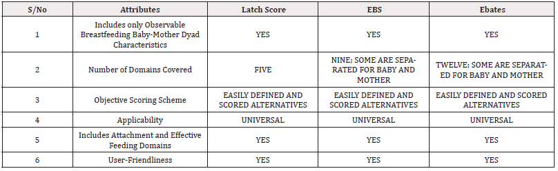 Some Breastfeeding Assessment Tools [11-22] have been identified in this Communication without disposing their Operational Details which are presented in some other Comminications [21,22,41]. It is reportedly suggested that several ‘Breastfeeding Assessment Tools’ have various and varied Strengths and Weaknesses including but not limited to: Breastfeeding Domains Coverage, Independent Objective Validation, Universal Applicability, Objective Scoring Schemes, Quality of Study Designs, Correlation Studies with Breastfeeding Outcomes, Observable Parameters-based, Questionnaire-denominated, User-friendliness etc [23,41]. The WHO/ UNICEF B-R-E-A-S-T-Feed Observation Form [20] reportedly has many positive attributes [23,41] but lacks an ‘Objective Scoring Scheme’ [21,22]. Only one Tool, the Breastfeeding Evaluation and Education Tool (BEET) [15], reportedly had 100% Breastfeeding Domains Coverage [41] but it also lacks the Objective Scoring Scheme [21,22]. Also reportedly, lack of agreement or commonality of how best to Assess Breastfeeding using the various Tools is a difficulty with most extant Breastfeeding Assessment Tools and Exercise [41]. Therefore, three Breastfeeding Assessment Tools which were developed as Objective Scoring Schemes were selected for some Comparative Evaluations based on Critical Review of the Literature coupled with this Author’s longstanding years of Clinical Experience/ Expertise, Research and Practice of Child Health, Neonatal Medicine and Breastfeeding Medicine laced with extensive Breastfeeding Publications and National and International Programmatic Engagements and Interventions in Breastfeeding Initiatives. The selected Breastfeeding Assessment Tools are: LATCH Score [17] consisting of the ‘Breastfeeding Domains’ (Five Domains included): Latch, Audible swallowing, Type of Nipple, Comfort and Hold, the Eregie BREAST Score (EBS) [21] consisting of the ‘Domains’ (Nine Domains included): Body position (Mother and Baby), Responses (Mother and Baby), Emotional bonding (Mother and Baby), Anatomy (Mother only), Suckling (Baby only) and Time spent suckling and the Eregie Breastfeeding Assessment Tool Examination Score (EBATES) [22] consisting of the ‘Breastfeeding Domains’ (Twelve Domains included): Baby’s behavior, Mother’s behavior, Positioning (Baby and Mother), Attachment, Effective feeding (Baby and Mother), Health of the breast, Health of the Baby, Mother’s feel of feed, Mother’s level of comfort and Length of feed. In Research Governance Principles, and as a Research Strategy, the Methodology adopted for this Report is a Non-Clinical Comparative Evaluations with ‘No Contacts or Interventions’ between Patients and the Researcher as No Patient was Involved.
