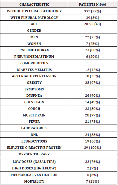 During the period from January 2020 to January 2021, 966 patients were admitted to hospital with a diagnosis of COVID-19. 29 (3%) patients presented some pleural alteration: 23 patients (80%) presented pneumomediastinum and 7 (20%) presented pneumothorax. The average age was 48.8 years. 22 (75%) men and 7 (25%) women. According to the days of hospitalization, the majority of patients presented on the 10th day of hospitalization. 100% of the patients presented obesity. 50% of the patients presented diabetes and hypertension as comorbidities. 80% of the patients presented dyspnea and chest pain as initial symptoms. In laboratory tests, 80% of the patients presented DHL upper limit.