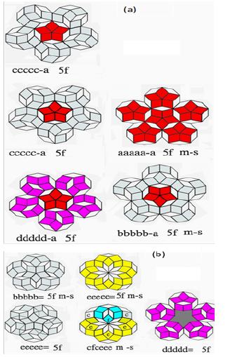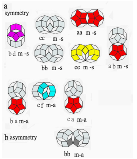 Figure 1 shows all six different types of decagons, (considered molecules), consisting of two rhombuses (considered atoms), with acute angles of 36 and 72 degrees. For the fat rhombus, the decagons of type-a, type-d, type-e and type-f are highlighted in red, pink, yellow, and light blue, respectively. Considering the decagons as molecules, these molecules may be coupled (reacted) together to form two atomic molecules, triatomic molecules, tetra-atomic molecules, penta-atomic molecules and hexa-atomic molecules. Figure 3 shows the coupling results of these imaginary reactions for bi-atom molecules of two different types: asymmetry and symmetry. The six molecules (decagons) in Figure 1a can be recombined in a symmetrical or asymmetrical manner to form more than hundreds of bi-atom molecules. They are labled as aa m-a, ab m-a, ac m-a and bb m-s, bd m-s and ccm-s, cf m-a, ee m-s, ef m-a, e.t.c., where a, b, c, d, e, f, are marked for six decagons in Figure 1a as a molecule, respectively and m-s and m-a marked as mirror symmetry and mirror-asymmetry, respectively. The diatomic molecules that cannot be further coupled and would later generate defects are specifically labeled with the dark gray diamond colour. Figure 3 shows just a few diatomic molecules that could be used as an example in the next tiling work to form smaller clusters of pentagonal or circular shape.