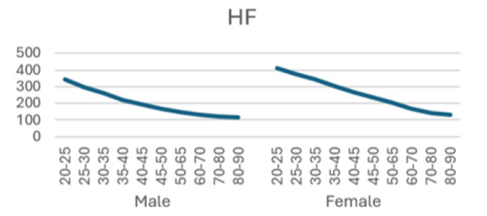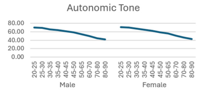 Additionally, (Figures 1-8) depict the graphical distribution of each HRV metric across the different age groups. Specifically, LF/HF demonstrated a pattern of initial increase followed by decline with age. Other indicators, including HRV, rmsSD, SDNN, total power, LF, HF, and autonomic tones, all exhibited a negative correlation with age, indicating a general decline in heart rate variability as individuals age. Additionally, the indicators demonstrated variability across gender groups, with males and females showing different patterns in HRV metrics.