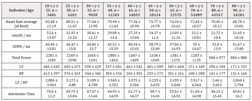 (Table 2) is similar to (Table 1) but (Table 2) is the detailed results from female subjects in this study, mean +/- standard error of the mean, with the data shows the breakdown by age categories comparing average heart rate, rmsSDm/ ms, SDNN/ms, Total power, LF and HF and the ratio or LF/HF and the autonomic tone in the female subjects. In our data analysis, there are both age and gender related differences and a a generalized trend to over time to observe a decrease from the initial values in the youngest group at 20-25 year age group to the oldest group at 80-90 age group in the parameters evaluated in this table.