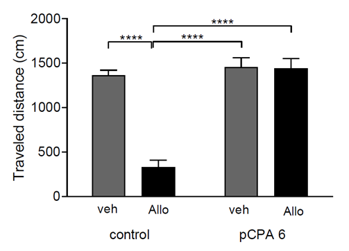 Figure 2: Effect of Allo on Locomotor Activity. Results are expressed as mean ±SEM of distance traveled in control veh (n=10); control allo (n=11); pCPA veh (n=9) and pCPA Allo (n=15). ****p<0.0001 for one-way ANOVA.