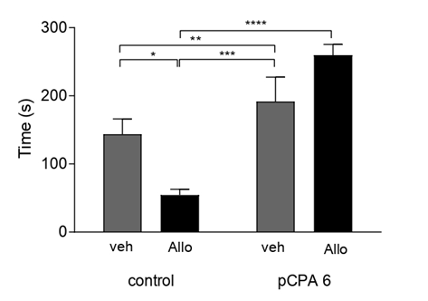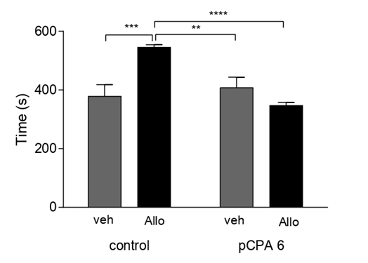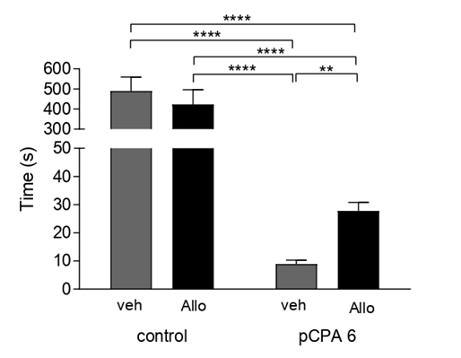 Figure 4: Effect of Allo on Social Behavior: Results are expressed as mean ±SEM of social time in second in control veh (n=10); control allo (n=11); pCPA veh (n=9) and pCPA Allo (n=15). *p<0.05; **p<0.01; ***p<0.001; ****p<0.0001 for one way ANOVA.