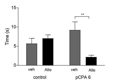 Figure 6: Effect of Allo in Aggressive Behavior: Results are expressed as mean ±SEM of aggressive time in second in control veh (n=10); control allo (n=11); pCPA veh (n=9) and pCPA Allo (n=15). **p<0.01 for one-way ANOVA.