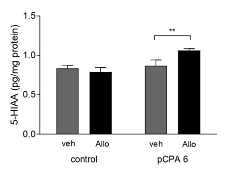 Figure 8: Effect of Allo in 5-HIAA content determination by HPLC in the olfactory bulb: Results are expressed as mean ±SEM of pg/mg proteins in control veh (n=8); control allo (n=8); pCPA veh (n=7) and pCPA Allo (n=8). **p<0.01 for one-way ANOVA.