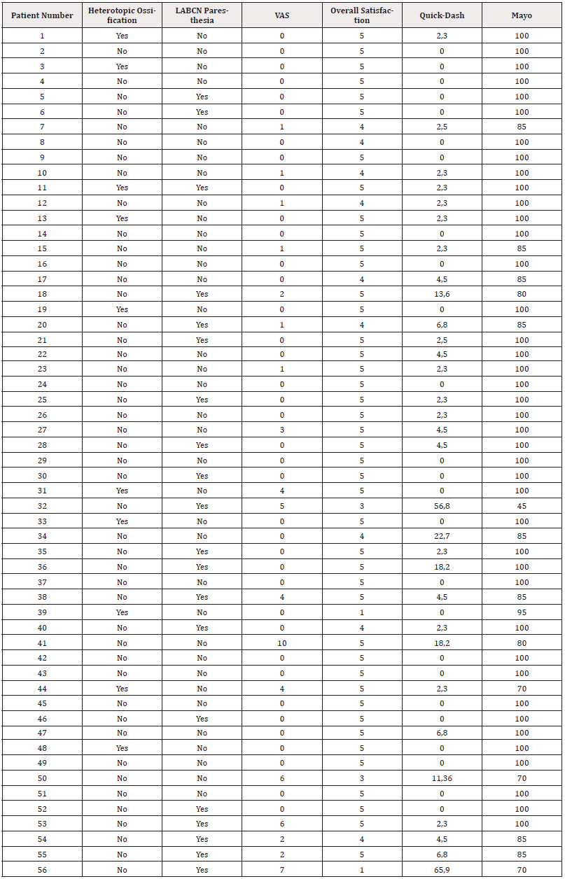 Results: The mean VAS pain was14 1,04 (0,00 - 10,00) and the mean overall satisfaction score was 4,62 (1 - 5). Mean QuickDASH and the Mayo Elbow Performance (MEPS) scores were 5,16 (0 - 65,90) and 94,46 (45 - 100), respectively. When comparing patients who underwent surgery ≤ 30 days since the injury (39) with those whose surgery was performed > 30 days (17), we found a statistically significant difference regarding QuickDash and MEPS, with better outcomes in the former group (p=0,031 and p=0,024, respectively). The overall complication rate was 62%: 13 patients had heterotopic ossification and 23 patients reported transient neuropraxia of the lateral antebrachial cutaneous nerve without repercussion over the clinical results. The elapsed time since injury to surgery was not significantly correlated to complication occurrence.