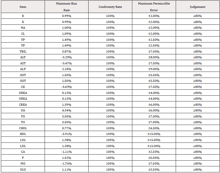 The results of correctness are shown in Table 1, and the maximum bias of all 22 routine biochemical items ranged from -3.91% to 4.34%, and the test bias of all 22 routine biochemical items were not more than half of the maximum deviation allowed by the WS/ T403 2012 standard, which sufficiently proved that their accuracy meets the requirements.