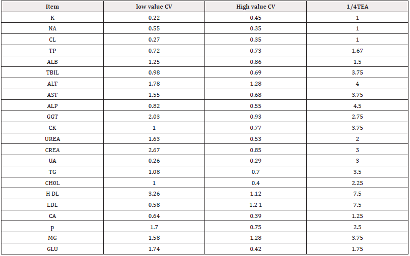 In conclusion, the intra-batch and intermediate precision of all 22 routine biochemical indicators were less than the corresponding standards, and the precision met the clinical needs.