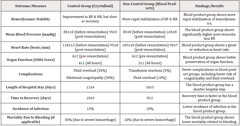 Results: The blood product group showed superior outcomes in terms of survival, hemodynamic stability, and organ function. The mean blood pressure was significantly higher post-resuscitation in the blood product group compared to the crystalloid group. Additionally, organ function improved faster in the blood product group, with lower SOFA scores at 48 hours. Complications such as fluid overload and dilutional coagulopathy were more common in the crystalloid group. The length of hospital stay and recovery time were also shorter in the blood product group.