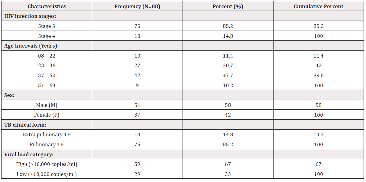 The demographic characteristics of the study participants have shown that 10 (11.4%) out of 88 HIV and TB co-infected patients were aged 08 to 22 years old, 27 (30.7%) were aged 23 to 36, and most of the participants 42 (47.7%) were aged 37 to 50 years old while only 9 (10.2%) were in the interval of age 51 to 63 years old. According to gender, most of the patients were males, 51 (58.0%) while females were 37 (42.0%). Most of the participants, 75 (85.2%) were HIV infection stage three (3) and had pulmonary TB while 13 (14.8%) of them were in stage four (4) with extra pulmonary TB. A large number of these patients 59 (67%) had a higher viral load (> 10,000 copies/ml) while 29 (33.0) of them had a lower viral load (≤ 10,000 copies/ml) (Table 1).