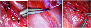 After both ends of the graft were evenly cut, the vessel lumen was irrigated with a 0.1% heparin saline solution to prevent thrombosis during the grafting procedure. Alternatively, 0.5% procaine or 3.8% sodium citrate solution could also be used for irrigation to ensure optimal blood flow and reduce the risk of clot formation within the vessel. Following the completion of the end-to-end vascular grafting procedure in the experimental rat model, the Acland test was performed to assess the patency and functionality of the graft (Figure 1). This test evaluated blood flow through the grafted vessel, ensuring the anastomosis was secure and unobstructed [10- 11].