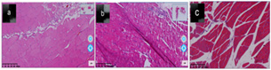 (Figure 3) In the figure A is 3 days donor graft 21 days femoral tissue analysis, Most of the connective tissue, muscle fibers, muscle bundles and cell tissue boundaries become clear, and the broken parts gradually return to normal. b is 7 days donor graft 21 days femoral tissue analysis, Most of the connective tissue, muscle fibers, muscle bundles and cell tissue are not particularly clean, and most of the broken tissue is not yet healed. C is a tissue analysis of thigh muscles from control rats, muscle tissue, connective tissue, muscle fiber, muscle bundles and cell tissue are clearly defined, and the shape is normal.