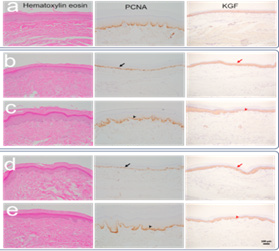 (Figure 5) In the figure A is a control group. b is Ischemia 3 days group. c is Ischemia 3 days group 21 days of vascular end-to-end grafting. d is Ischemia 7 days group. e is Ischemia 7 days group 21 days of vascular end-to-end grafting.The skin tissue of the paws was stained with hematoxylin and eosin to evaluate the morphological structure. At 3/7 days of ischemia, the squamous cell layer decreased and the epithelium became thinner. At 21 days after vascular grafting, skin regeneration was activated. Epithelial thickening was observed due to squamous epithelial hyperplasia. To confirm the above changes, immunohistochemical analysis of PCNA protein revealed a significant decrease in the number of PCNA-positive cells in the squamous epithelium at 3/7 days of ischemia (black arrows). The longer the duration of ischemia, or at 7 days of ischemia, the more the number of regenerating cells decreased. At 21 days after vascular grafting, the number of PCNA-positive cells increased, indicating that the regeneration of the paw skin was intensified (black arrows). PCNA-positive cells increased, but the staining intensity was weaker than that of the control group. KGF, a protein that promotes skin regeneration, was similarly expressed in the squamous epithelium of the paws of control rats, at 3/7 days of ischemia, and at 21 days after vascular grafting (red arrows). This suggests that KGF is secreted by squamous cells to promote regeneration during hypoxia.