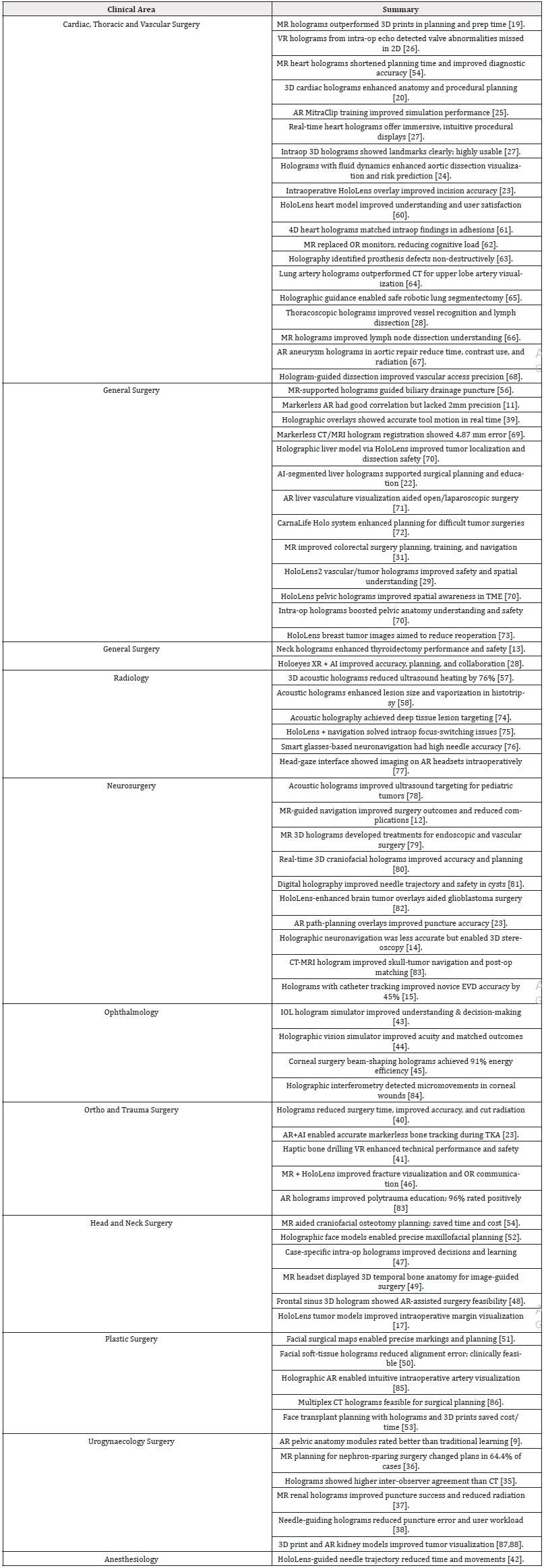 No meta-analysis was performed. Instead, trends were qualitatively analyzed, and outcomes were compared within and across specialties to identify common benefits and limitations of holographic implementation (Table 1).