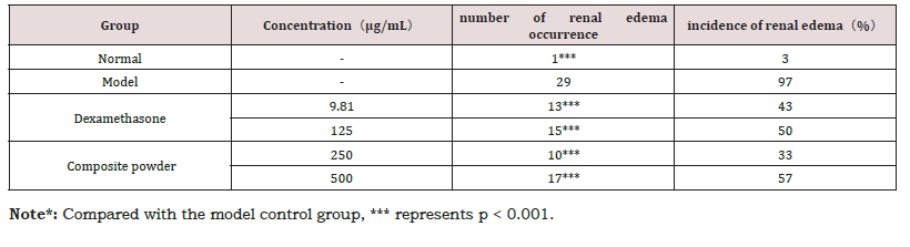 The renal protective potential of the composite powder was evaluated in an Aristolochic Acid (AA)-induced acute kidney injury model. AA administration resulted in a high incidence of renal edema (97%) in the model control group. As presented in Table 6, treatment with the composite powder significantly reduced the occurrence of renal edema at all tested concentrations. The most pronounced protective effect was observed at 250 μg/mL, which reduced the incidence to 33%, outperforming the positive control, dexamethasone (43%). A typical image of renal edema is provided in Figure 2 for morphological reference (Table 6) (Figure 2).