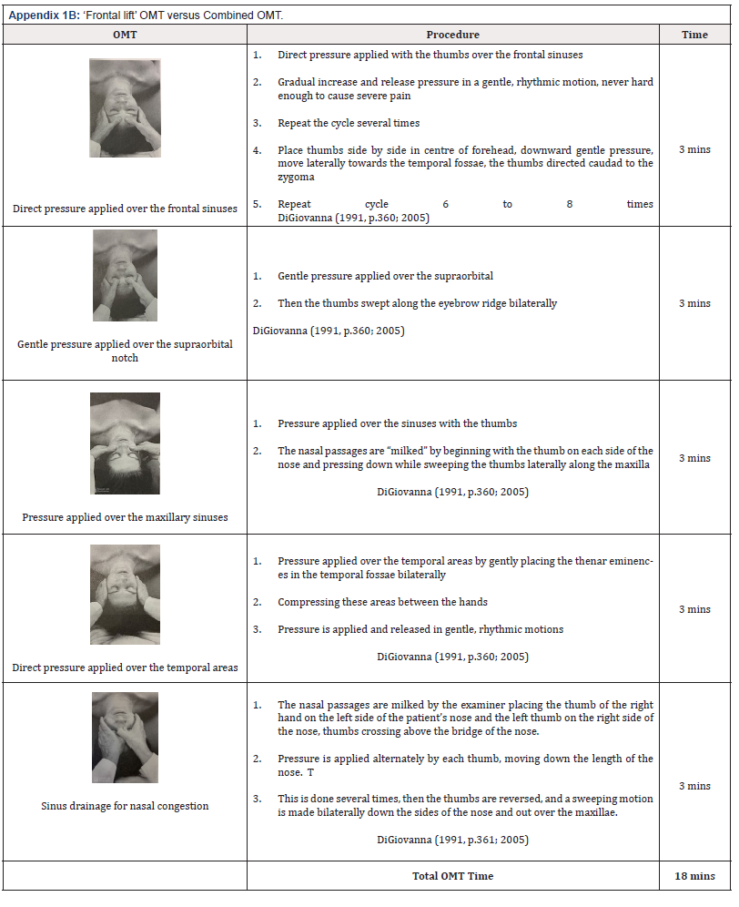Lee-Wong et al. [12] offers a viable opportunity for further research. Building on from this study by investing the effect of ‘frontal lift’ OMT - a craniosacral technique to release restricted side of the frontal bone to achieve balance of both sides to affect sinus congestion in the ethmoid or frontal sinuses cited in DiGiovanna & Schiowitz [28,29] and Greenman [31], the potential benefits of using a streamlined technique requiring less treatment time, may improve patients’ comfort. Therefore, affording the practitioner more time available to treat the patient’s other tissues causing symptoms. This streamlined ‘frontal lift’ OMT to coronal suture claims to open the coronal suture and therefore opens the drainage passages of all sinuses as shown by Lintonbon [15]-See Appendix 1A-to ease facial-maxillary sinus headache. Hence this study is to test the streamlined ‘frontal lift’ OMT use on its own is sufficed, comparing with the combined OMT (Appendix 1B) for CRS patients. Therefore, a shorter treatment time by 60% (reduced from 18 mins to 6 mins). Thereby enhancing patient comfort (Appendix 1A).
