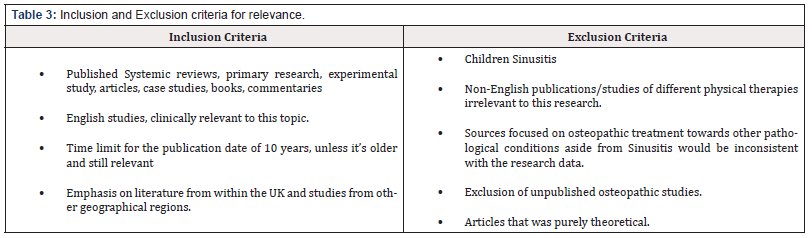 The objective of this review focuses on the effectiveness of OMT in certain studies and articles which were assessed using a critical appraisal tool (CASP, 2018). As there is scarce evidence based systemic reviews and meta-analyses in OMT from randomized control trials (RCT’s) to measure the efficacy of OMT on sinus pain and the beneficial outcomes in the United Kingdom, and so the search was expanded to include other manual therapies in European and United States.
