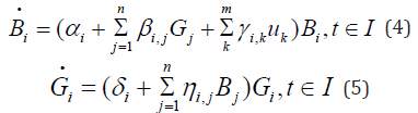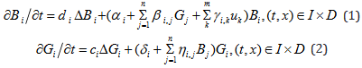 These equations describe the temporal and spatial evolution of the antibodies and antigens. The parameters , {di ci} are the diffusion coefficients and Δ denotes the Laplacian in , R3,{αi} denote the production rates of antibodies by the natural immune system, βi, j is the interaction coefficient of the i-th antibody with the j-th antigen and γi,k is the production rate of antibodies induced by the control drug k u . If , γi,k =0 , the k-th drug has no contribution towards the production of antibody Bi. The parameters {δi} denote the intrinsic growth rates of antigens (for example cancer cells) and ηi, j denotes the interaction coefficient of the population of antibodies with the i-th antigen. The values of these interaction coefficients are generally negative. The objective is to promote the growth and strength of antibodies which can destroy the antigens. This is done by prescribing appropriate drugs (foods) for a period of time I [0, T] so as to eliminate the antigen population or bring it down to a harmless level. To achieve this goal one may choose the objective functional as