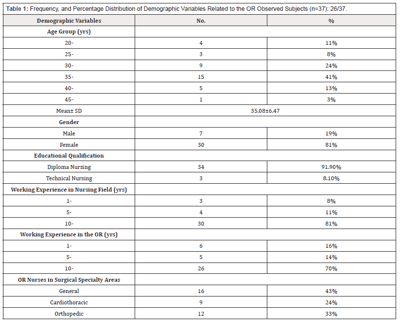 Table 1:Frequency, and Percentage Distribution of Demographic Variables Related to the OR Observed Subjects (n=37): 26/37.