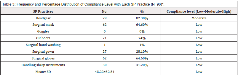 Table 3 illustrates that the compliance level with headgear practice among OR nurses was 79/96 (82.3%) (Moderate compliance level). Compliance level with the use of mask and surgical gloves were 62/96 (64.6%) (Low compliance levels). The compliance with the use of OR boots, surgical hand washing, surgical gown, handling sharp instruments were 71/96 (74%), 1/96 (1%), 27/96 (28.1%), and 30/96 (31.2%) respectively (Low compliance levels). The compliance with goggles practice was zero, it was worth saying that, the total mean of compliance level with the eight SPs practices among OR nurses was low (43.22±32.54).