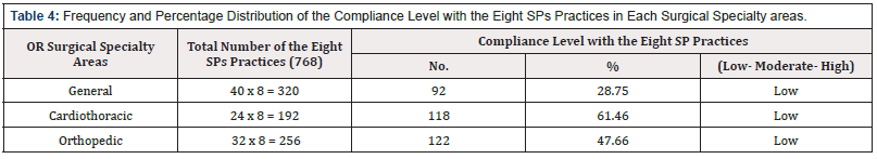 Table 4: Frequency and Percentage Distribution of the Compliance Level with the Eight SPs Practices in Each Surgical Specialty areas.