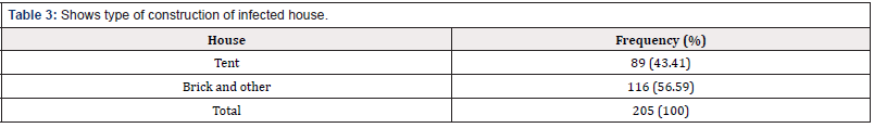 Concerning areas and residency, type of construction, seems to have significant effect on morbidity with parasite. Therefore, data obtained showed that people who lived in Brick and mud or destruction houses were associated with highest morbidity (56.59%), while in Tent (43.41%) (Table 3).