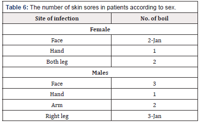 A cutaneous leishmania sislesion observed in many parts of body’s patients. However, a difference in the percentage of skin infestations noted, including face, hand, and arm and leg (Table 5). The skin lesion appeared high at face for females (1-2) and males at face and right leg 3 and 1-3 respectively compared to other site of body (Table 6). There was a significant correlation between the numbers of skin abrasions and present dead or alive parasite at the site of infection.