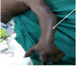 Figure 2: Patient reviewed at J 36 post discharge fasciotomy with sequelae of retractile scarring, stiffness of the left elbow, limitation of prono-supination movements of the left wrist.