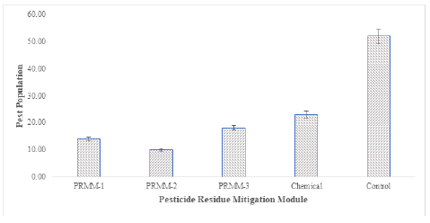 As shown in the Figure 2 given below it was estimated that pest population was minimum in PRMM-2 where IPM was used along with soft insecticides followed by PRMM-1 where only IPM was applied as pest suppression tool. Pest infestation was calculated as 7.34% in PRMM-2 and 13.87% in PRMM-1 while pest population in PRMM-3 was recorded as much as 22.04% where synthetic pesticides were used combined with attract and kill baits. PRMM-4 received 28.57% pest infestation where only chemicals were applied. All of these modules were compared with the control module where no pest suppression tactics were applied, and pest infestation was maximum, and it was as high as 66% pest infestation.