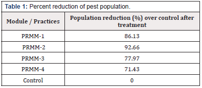 Pest population showed different response against modules. The maximum response showed by mango pests in PRMM- 2 (cultural + mechanical + GF-120+ methyl euginol with Melathion × Spinosad) where the population was minimum (10%) as compared to control (52%) and different other modules. Pest population were 14%, 23%, 18% in PRMM-1 (cultural + mechanical + GF-120 + methyl euginol with Melathion), PRMM-3 (insecticides + protein hydrolyze with Spinosad) and PRMM-4 (pesticides) respectively. The results described the significance of the IPM tactics over the use of insecticides. PRMM-2 was 42% more responsive against mango pests over control followed by PRMM-1 which was 38% more responsive. PRMM-3 and PRMM-4 showed 34% and 29% more response of the pest population over control (Figure 1).