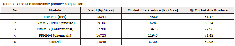 All the 5 modules which were applied and compared have their own benefits and draw backs in terms of yield. After the mango season was complete yield of 5 modules which were implemented was calculated and compared The loss of the produce was measured in term of quality and quantity of the fruits because not all the pests cause quantity loss such as meallybug and mango hopper but fruit fly cause quality loss of the produce. PRMM-2 gave maximum yield 19106 Kg/Acre from which 85.24% was marketable yield followed by PRMM-1 with 18341 Kg/Acre and 81.12% marketable yield. PRMM-3 produced 17280 Kg/Acre with 77.96% marketable fruits followed by PRMM-4 with 16723Kg/Acre and 71.42% marketable yield and all of these modules were compared with a control module where yield was calculated as much as 14545Kg/Acre while only 59.95% was marketable yield. PRMM-2 produced 25.29% more marketable fruits in comparison of control module while PRMM-1 produced 21.17% more marketable fruits over control. In case of PRMM-3 and PRMM-4 the percentage of surplus marketable produce over control was calculated as 17.21% and 11.47% respectively (Table 2).