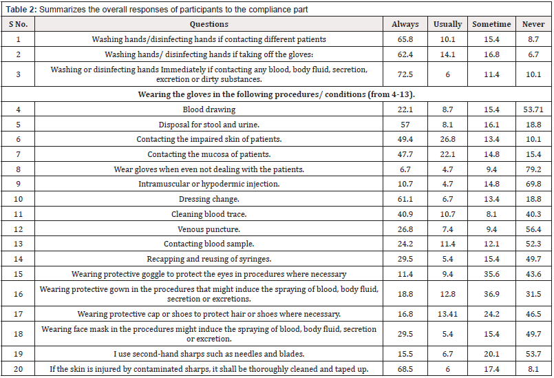 A study conducted in China by Luo, Y on nurses’ compliance to SPs found that 64% of nurses have good compliance to standard precautions. Study on student’s compliance to SPs in six public and four private universities in Joran resulted in mean compliance score was 67.4% [10]. Whereas students in Mazdaran hospital depicted different findings; the study reported that that 6% to 37% of health care workers and 47% medical students don’t know about standard precautions [15]. Students nurses in different hospitals of Hong Kong China shows that the overall compliance frequency was 4.38+0.40 out of 5 [16]. Mean compliance of students’ nurses in Jordin was 67 out of 80 marks [16,17]. Whereas 57% of the HCWs including doctors and Nurses has good compliance to SP in Zagazig university hospital Egypt [18].