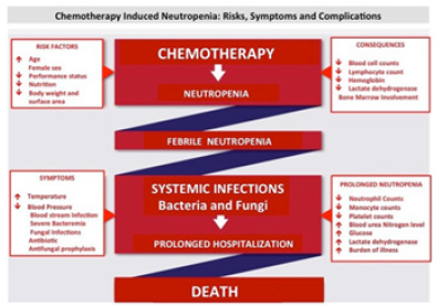 Neutropenia is a serious adverse effect frequently associated with cancer chemotherapy (1,7). Loss of neutrophils causes disruption of immune defense mechanisms and increases the likelihood for infections. Infections lead to fever known as febrile neutropenia (FN). According to the European Society for Medical Oncology (ESMO), FN is defined by oral temperature greater than 38.5 °C for two consecutive readings within 2h and an absolute neutrophil count (ANC) below 0.5 x 109/ (1). Neutrophils (Figure 1) constitute the first line of defense against invading pathogens. Reduction of ANC leads to a predisposition to infection caused by bacteria and fungi [1,2]. Chemotherapy induced Neutropenia (CIN) and its consequences are described in (Figure 1).