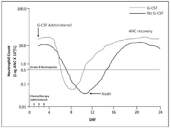 In addition patients suffering from febrile neutropenia may be given prophylactic G-‐ CSF during the next and subsequent chemotherapy cycles. Prophylactic G-‐ CSF can significantly reduce the depth and duration of neutropenic nadir [15,16]. The long-‐ acting peg-‐ filgrastim has several advantages including convenience of administration to patient, improved compliance and greater potency [7]. Multiple randomized controlled trials (RCTs) have demonstrated the safety and efficacy of CSF use in patients admitted to the hospital with FN following cancer chemotherapy [15,16]. However, a recent review of FN patients who received G-‐ CSF in addition to antibiotics showed no significant effect on overall mortality [15,17]. Though the duration and depth of neutropenia seemed to be reduced in participants receiving G-‐ CSF and antibiotics compared to patients who received antibiotics alone, G-‐ CSF did not significantly reduce the risk of infections and related complications from occurring during the neutropenic episode [3,15]. The risk of systemic infections and sepsis increases in direct proportion to the severity and duration of neutropenia [3]. Another study revealed that although myeloid growth factors, such as G-‐ CSF reduce the duration and depth of neutropenia (Figure 3) but did not reduce infection and associated morbidity and mortality [6,11,13].