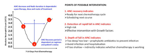 One of the major side effects of cancer chemotherapy is myelosuppression leading to an obligate period of neutropenia. Systemic infection resulting in neutropenic sepsis is the leading cause of morbidity and mortality in cancer patients. Due to these reasons chemotherapy induced neutropenia has been considered as an “oncologic emergency”. The current system of management of febrile neutropenia involves administration of prophylactic antimicrobials and hematopoietic growth factor supplements (granulocyte colony stimulating factor G-‐ CSF). However, neutropenia is detected in these patients only after the onset of infection limiting the efficacy of these therapeutic interventions. Repeated infections results in prolonged periods of hospitalisation, delay in treatment and chemotherapy dose reductions. Therefore, timely detection of neutrophil nadir and prevention of systemic infection can significantly improve the outcome of cancer treatment.