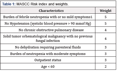 The Multinational Association of Supportive Care of Cancer (MASCC) risk-‐ index scoring system was designed for identifying cancer patients with high risk of CIN [18]. The tool consists of 8 factors that can be easily assessed upon admission with FN. Patients with a score greater than 21 are considered low risk, and patients with lower scores are considered at a higher risk and need more intensive management. Poor predictors of prognosis include age greater than 60, moderate symptoms with febrile neutropenia, hypotension, dehydration, inpatient status, and prior fungal infection [18]. The MASCC Risk Index can identify patients at low risk for complications and that it could be used to select patients for further monitoring and administering cost-‐ effective therapies. The MASCC Risk-‐ Index Scoring system is shown in (Table 1). This tool was endorsed in 2002 by the Infectious Diseases Society of America and has also been adopted by the European Society of Medical Oncology [16]. The MASCC risk scoring system is extremely useful as it allows health care providers to determine a patient’s risk for developing medical complications from CIN and infections. A patient’s treatment plan can be determined based on their risk category. It is important to know whether a patient is expected to be at high risk for developing FN or has a history of FN, in order to take appropriate prophylactic measures [19]. The detailed treatment plan and clinical management of CIN is described in [5,19].