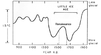 Figure 1 from study of the glaciers [5] reflects the temperature changes during the period 900-1900 A.D., which includes the last Mini Ice Age (1350-1800 A.D.). This study of the glaciers shows [5] that there was substantial warming right in the middle of the Ice Age in the 15th and 16th century (1500 A.D.-1600 A.D.), which is the Renaissance period. Warming around 15th century AD means that there was increased solar activity, which goes hand in hand with increased magnetic field of the Sun and consequently the Earth. Both stimulated the human brain and its creativity, which led to the blooming arts, literature, architecture, and the sciences called the Renaissance. This was the period of Leonardo da Vinci, Michelangelo, Galileo Galilee, etc. in Italy, but Renaissance was also taking place in France, Holland, England, etc. [6].