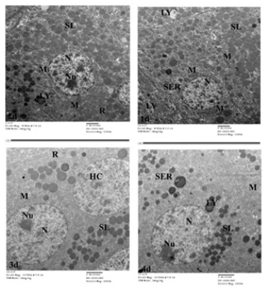 Figure 4:Ultrastructure of Zona reticularis of adult Rousettus Aegyptiacus. Figures.1d-2d-3d- 4d: Electron micrographs of the cells of zona reticulosa showing enormous lipids droplets ( L) and saturated droplet (SL), (v) vacuoles, (SER) smooth endoplasmic reticulum, (N) nucleus with nucleolus (Nu), (M) mitochondria, (V) Vacuoles, (R) ribosome’s, (PM) plasma membrane, (L) lysosomes and (HC) heterochromatin.